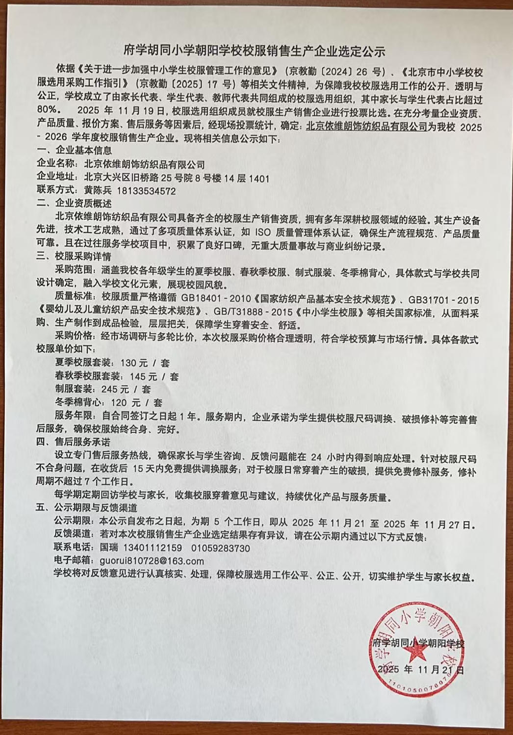 府学胡同小学朝阳学校校服销售生产企业选定公示