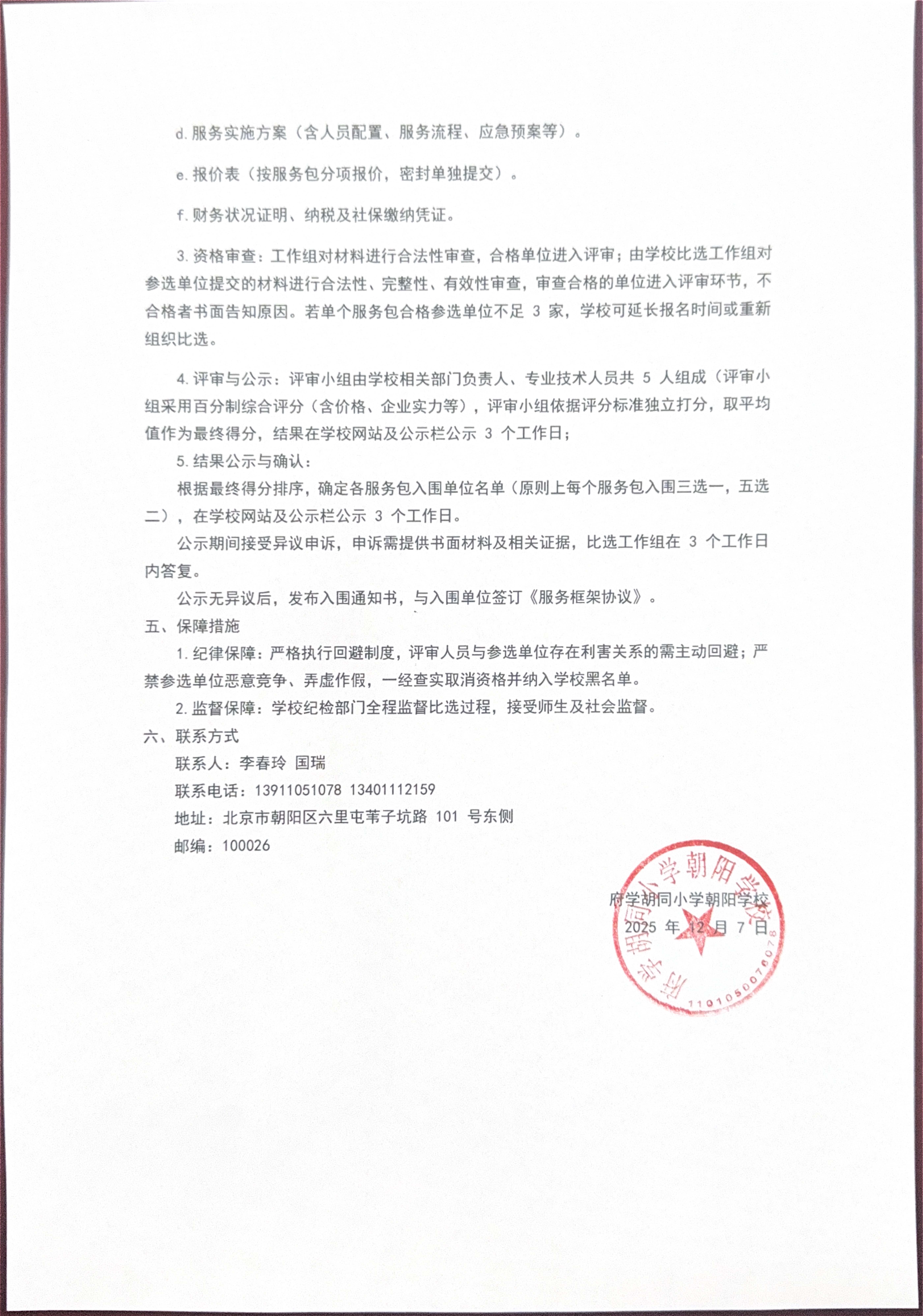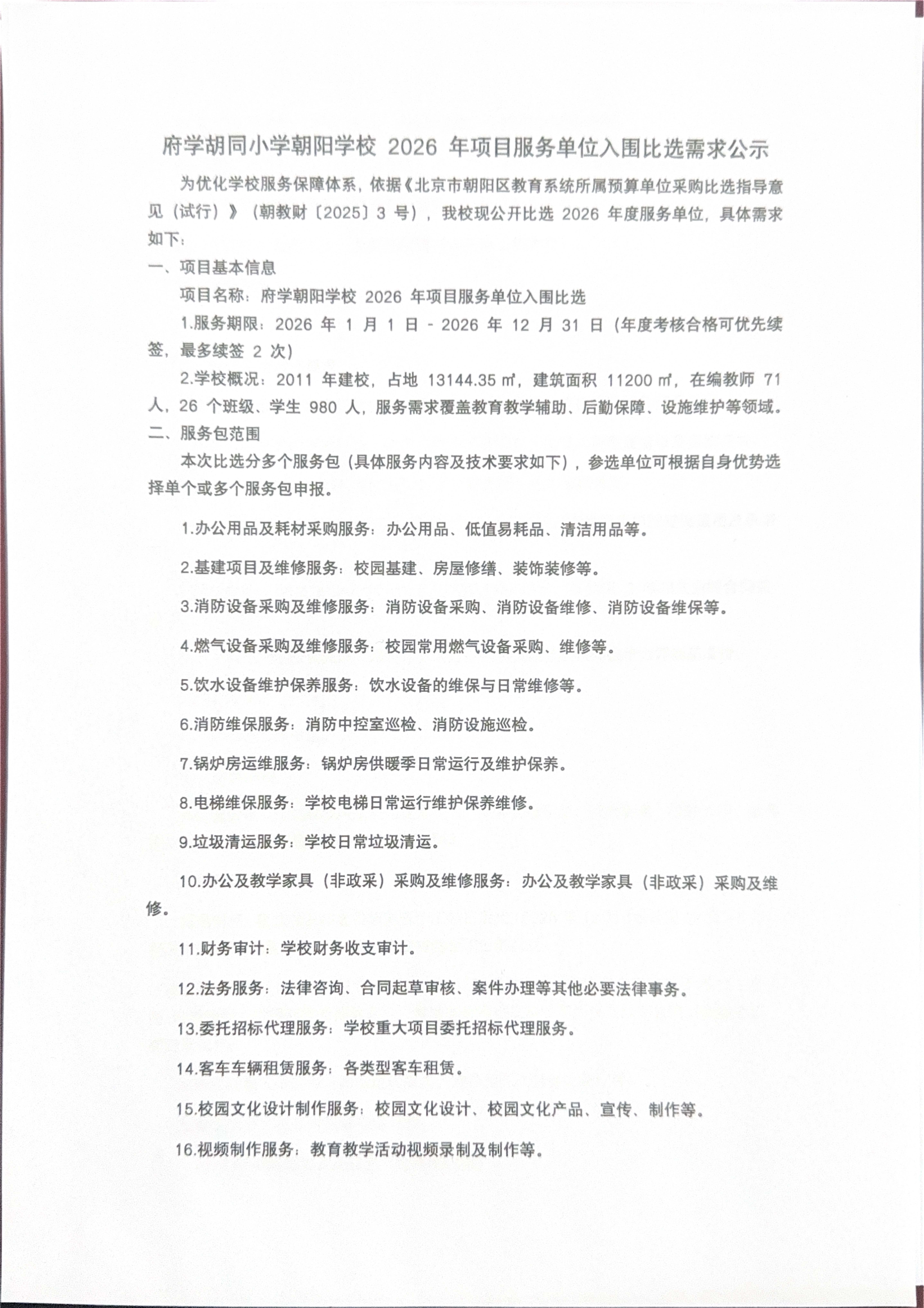 府学胡同小学朝阳学校2026年项目服务单位入围比选需求公示