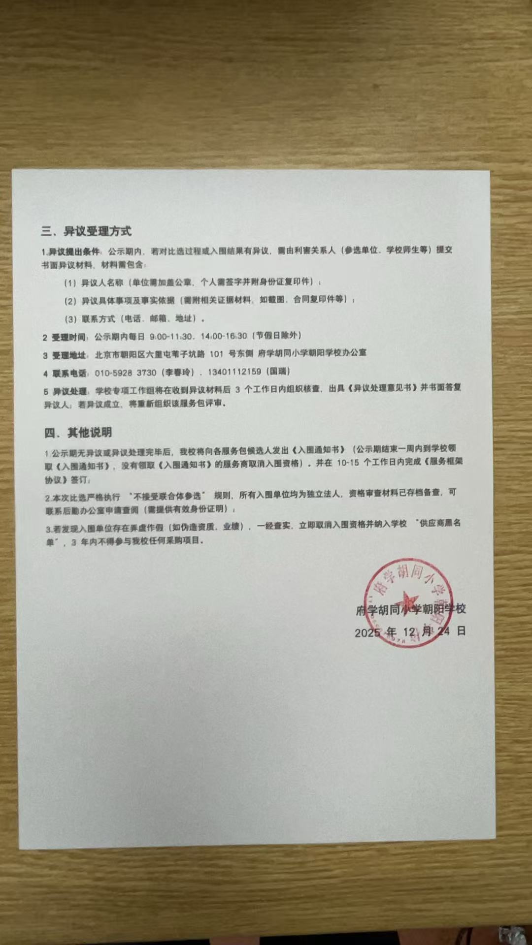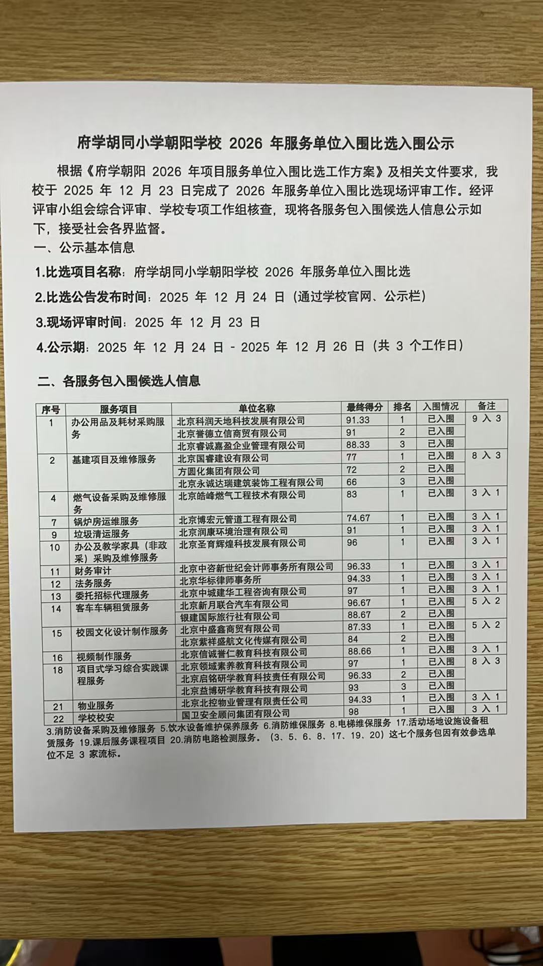 府学胡同小学朝阳学校 2026 年服务单位入围比选入围公示