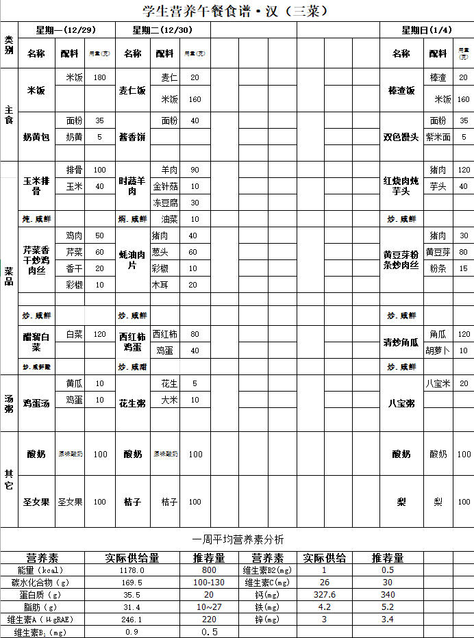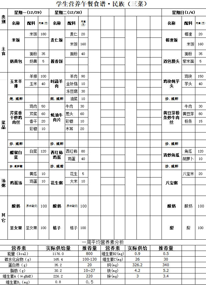府学胡同小学朝阳学校第十八周带量食谱(20251229-20260104)