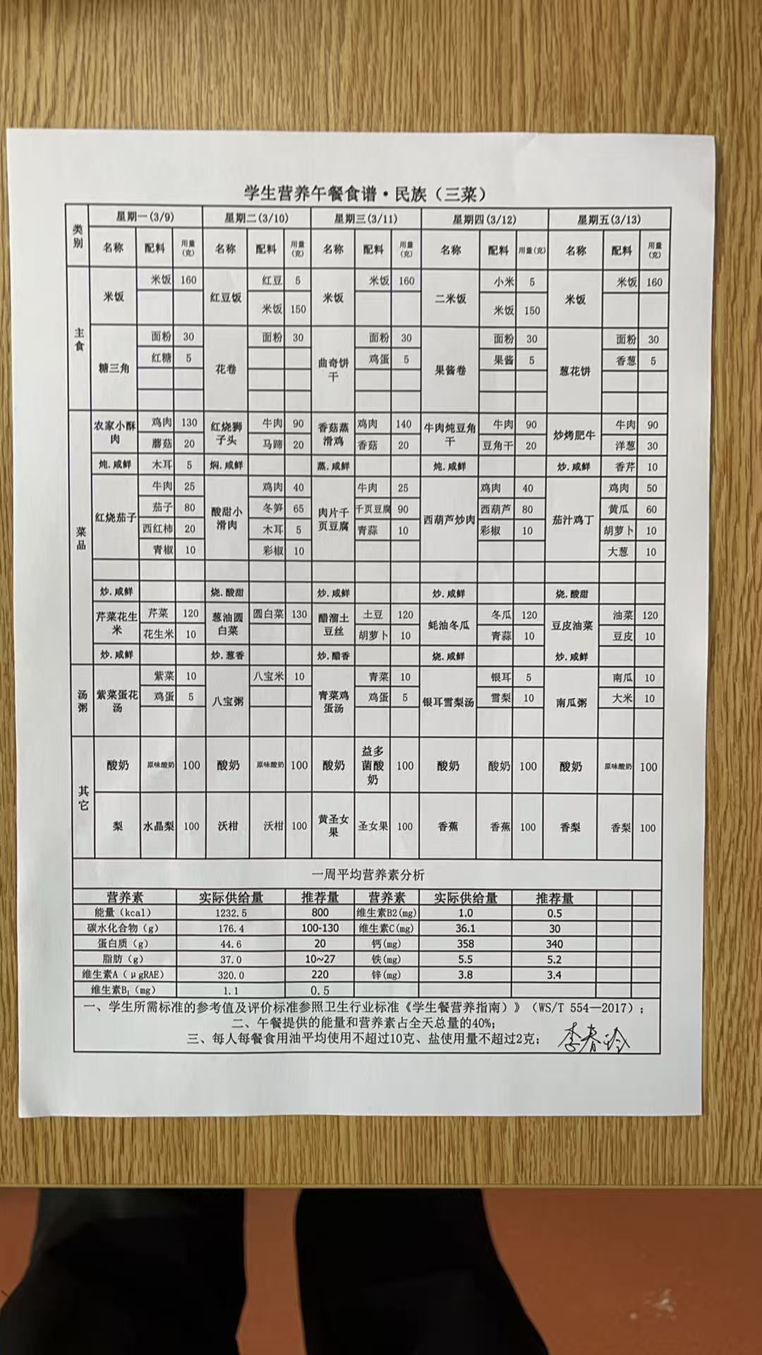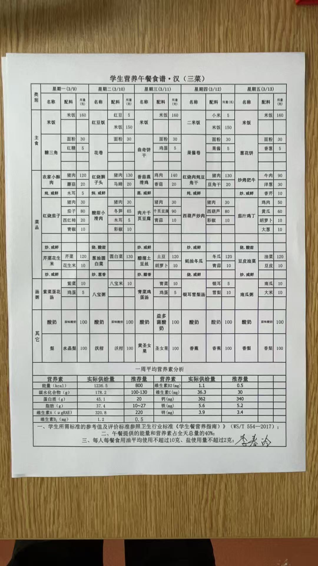 府学胡同小学朝阳学校第二周带量食谱(20260309-20260313)