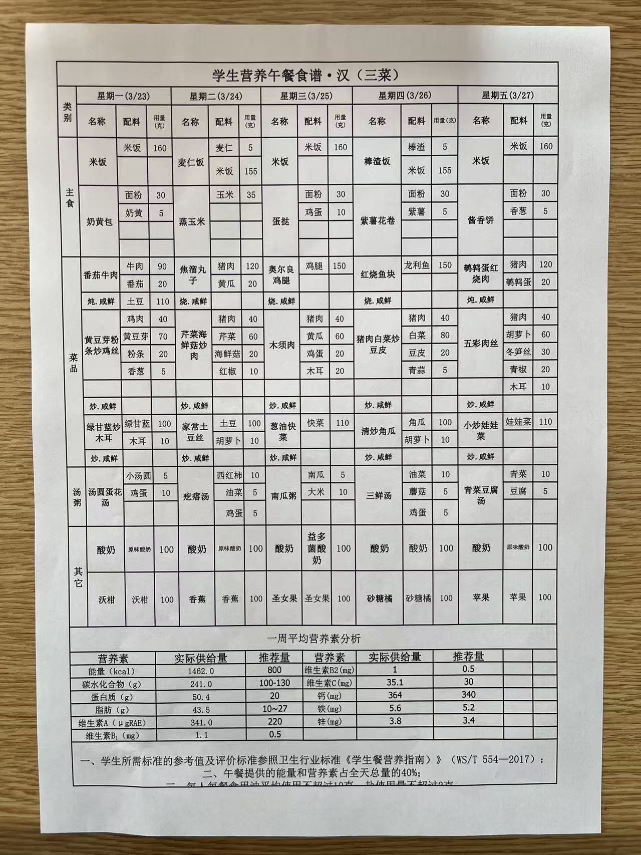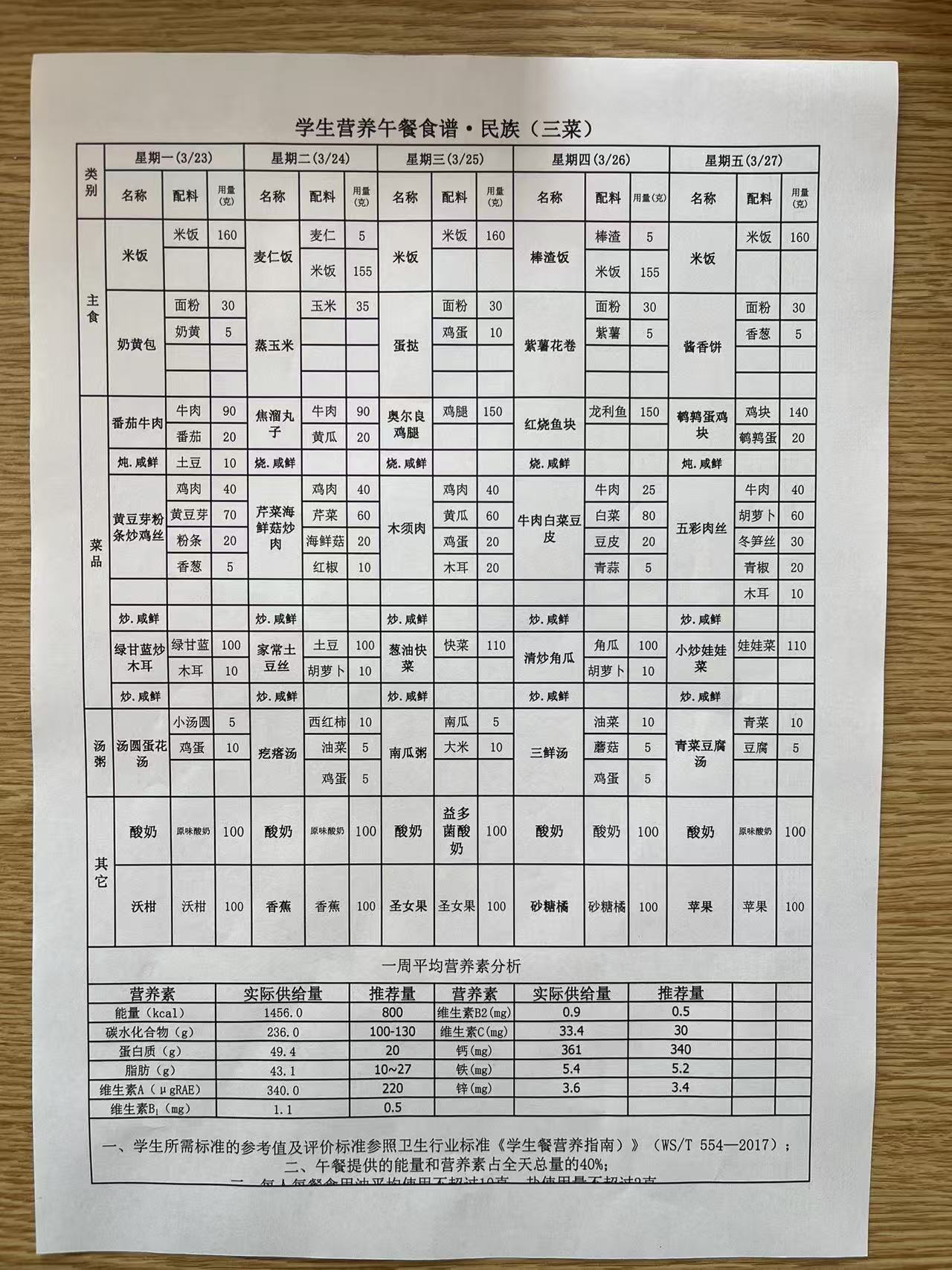 府学胡同小学朝阳学校第四周带量食谱(20260323-20260327)
